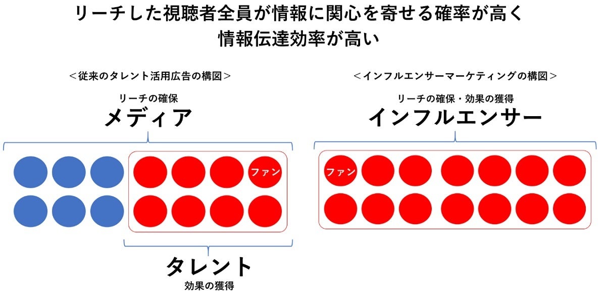 ファンやフォロワーにとって、インフルエンサーは「SNSを介してダイレクトにつながっていて、日常的に接点のある人物」なので心理的な距離が近く、彼ら/彼女らが発信する情報に対する信頼性も極めて高い。つまり、インフルエンサーによるクチコミは、認知と同時に、好意や共感、信頼にまで結びつきやすい。前述した様々なバリアを一気に飛び越えることができる、非常に効率的で効果的なアプローチなのです。