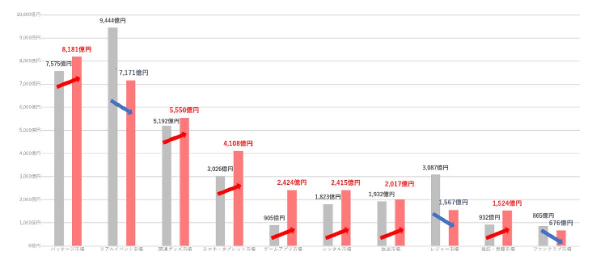 ここでもう一つご紹介したいのが、我々が行っている「コンテンツファン消費行動調査」です。毎年さまざまなカテゴリの市場規模を算出していて、今年エンタメ市場はさぞ落ち込んでいるだろうと思いきや、支出層全体を見るとコンテンツ消費額の単価が昨年よりも上がっていました(67,070円で前年対比+2,497円)。また全カテゴリーにおけるセグメント市場の変化を見るとコロナの影響により確かにリアルイベント市場、レジャー市場は落ち込んでいますが、その代わりにスマホ・タブレット市場、ゲームアプリ市場といったデジタルコンテンツ市場がかなり活性化している。加えてCD・本などのパッケージ、関連グッズ、雑誌や書籍などのデジタルとは直接のない市場も向上しているのは面白い点です。コロナによって、おそらくエンタメコンテンツの支出の出口、楽しみ方などが変わった結果、市場の増大にもつながっているのではないかと思います。