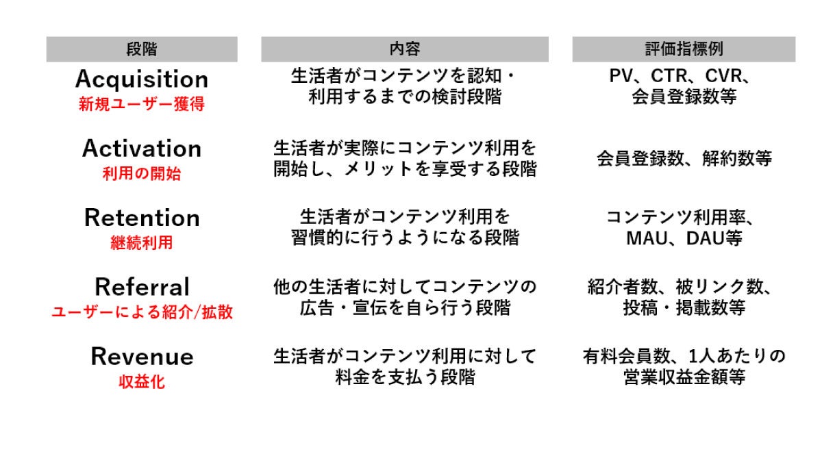 ではAARRRモデルに沿って、どのようにコンテンツフレームワークをとらえていけばいいのか、具体的に説明します。