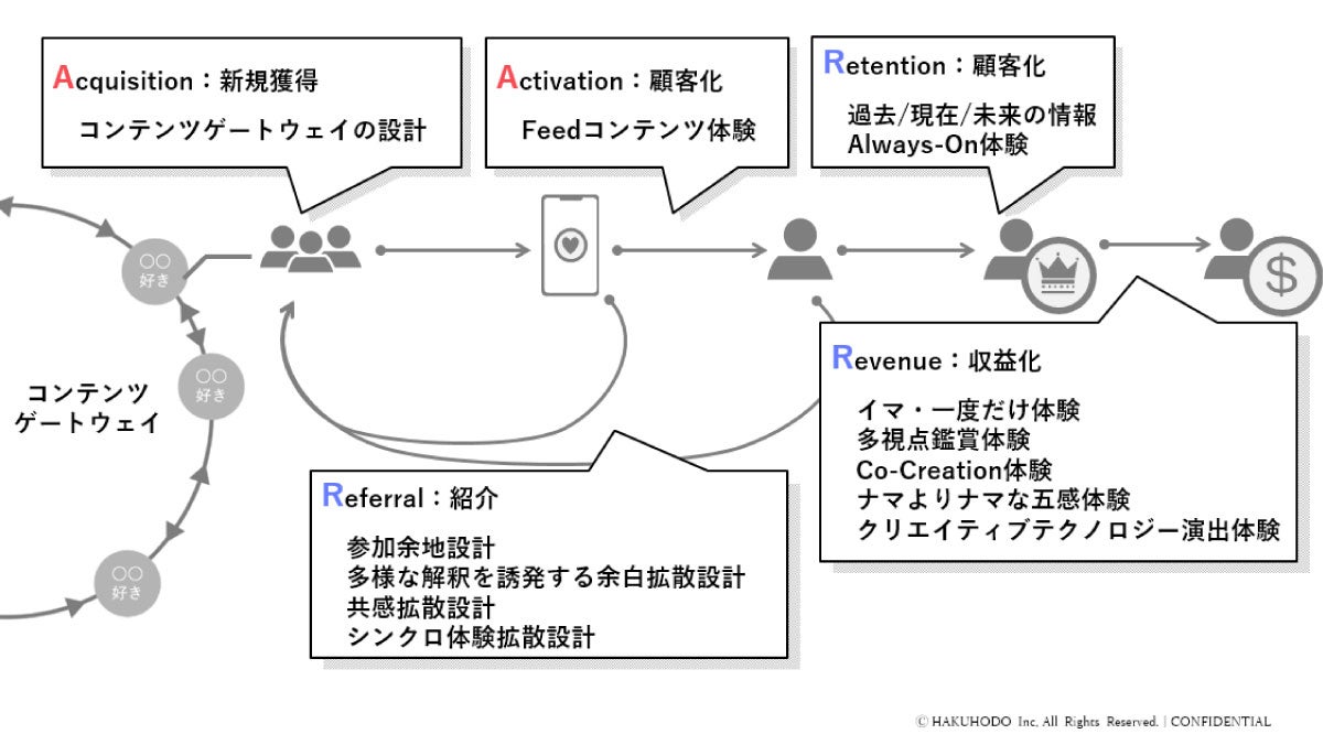 コロナ禍でさまざまな制約が発生、環境が変化したことで、すでにあったSNSやXR、VRといったクリエイティブ関連のテクノロジーが新しいインタラクティブなコミュニケ―ションや表現技法に活かされるようになり、市場活性化へとつながったわけですが、フィジカル上で得られていた体験を単にデジタル化するだけでは、新たなマネタイズのトリガーにはなりえないこともわかってきました。やはりデジタルならではの何か、体験や感情設計にひと工夫しなければならない。いま北原さんが説明したRetention(定着化)、Revenue(収益化)、Referral(紹介)のようなポイントは、そのトリガーづくりの重要なTipsになってくると考えています。