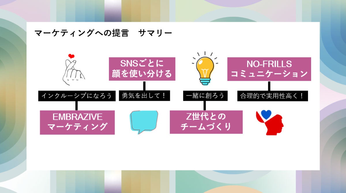 Z世代は、みんなの幸せを考え、みんなで格差、人権問題、コロナ禍などの問題を解決することに重きを置いています。どんな人にも優しい、誰一人として見捨てない、企業として”包容力のある”訴求やアクション“について考えてみることが大切です。彼らが大切にしている「EmbraZive(包容力のある)マーケティング」を具現化することを考えてみてください。