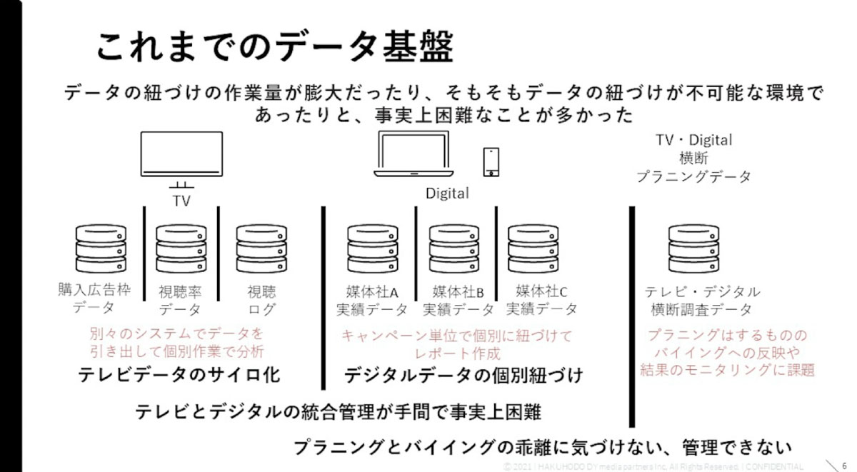 テレビのデータにおいては、データごとに集計や分析するシステム環境が異なり、横断して集計や分析をしようとすると、データを個別に抽出して手作業で紐づけ、集計分析する必要があります。テレビデータは非常に種類が増え、それに伴いデータ環境がサイロ化し、横断した集計や分析がしにくい、という課題がありました。
