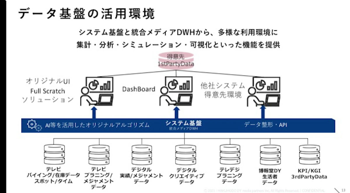 「その他のサードパーティデータ」が同一環境にあり、データにAI等を活用したオリジナルのアルゴリズムでシミュレーションや予測をする機能や、データを成形して提供するAPIを用意したシステム基盤となっています。