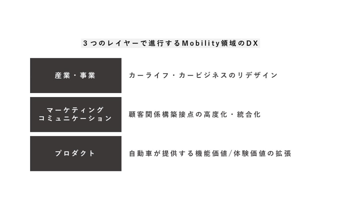 一つ目は、産業・事業のレイヤーで「カーライフ、カービジネス全体をリデザインする」という動きが進んでいることです。二つ目は、マーケティングコミュニケーションのレイヤーで「顧客関係構築接点の高度化/統合化」が急速に進展していることです。この二つについては、ここまでお話したことの繰り返しになりますが、自動車メーカーとディーラーによる従来の役割分担が変わって来ていることが背景にあります。そこを、新しい形で車を提供したり、プラットフォーマーを中心とした他企業と協力して施策を行うなどしたりして変化に対応しようとしています。三つ目は、プロダクトのレイヤーで「車の提供価値/体験価値の拡張」が進んでいることです。