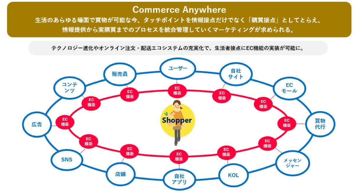 注目すべきは、生活者とのさまざまなタッチポイントにECの機能が実装され、情報接点がそのまま「購買接点」になりつつあることです。生活空間に存在するあらゆるタッチポイントが購買経路になる環境を私たちは「Commerce Anywhere」と呼んでいます。