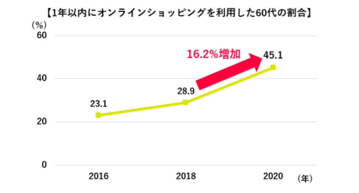 以前は、シニア層はECをあまり利用しないと言われていました。しかし、コロナ禍によってシニアのEC利用率が大きく伸びています。国内では2020年にオンラインショッピングを利用した60代の割合は、前年比で16.2%増えて45.1%と半数近くに達しました。