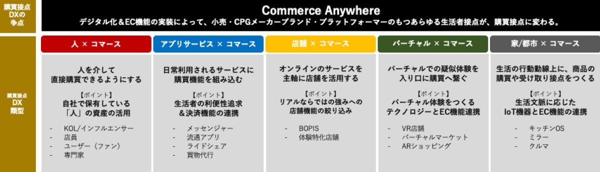 私たちは、日本、中国、アメリカ、東南アジアなどの動向を踏まえて、「Commerce Anywhere」を5つの型に整理しました「人×コマース」「アプリサービス×コマース」「店舗×コマース」「バーチャル×コマース」、そして「家/都市×コマース」です。