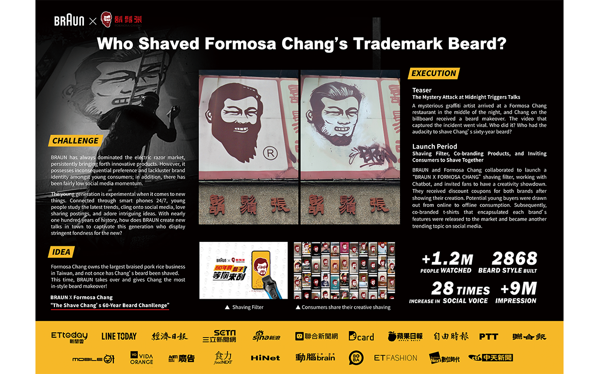 まず、謎のグラフィックアーティストが深夜にFormosa Changの店舗のひとつに到着し、看板に描かれたChang(創立者を模した髭のおじさんでチェーングループのシンボル)にひげのイメージチェンジを施し、その動画をSNSにアップしました。このティーザー映像は、期待通り若者によって一気に拡散され、「誰がChangの髭を剃ったんだ?」と盛り上がる中、2日後には満を持して「BraunとFormosa Changの合同キャンペーンである」ことを発表したのです。