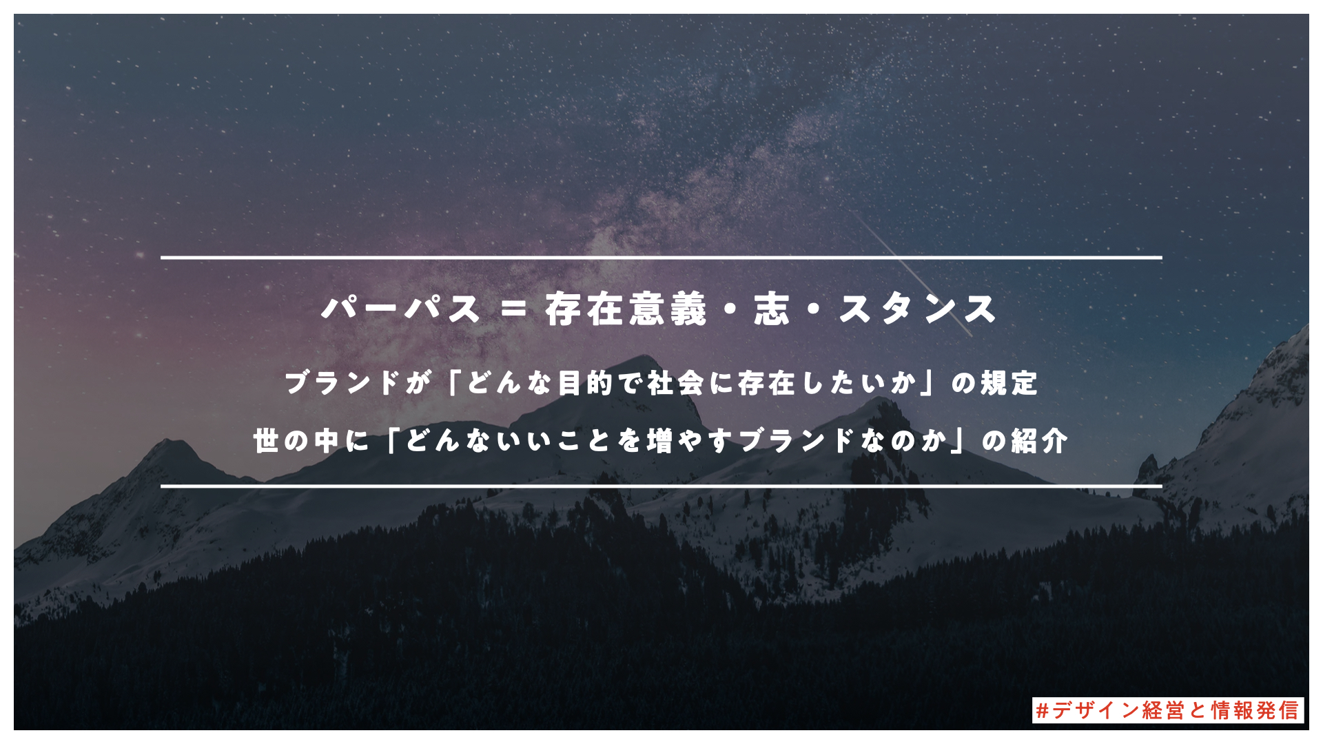 なぜその会社が社会に存在しているのか、その「なぜ」の部分にこたえるのがパーパスで、企業やブランドが何に責任を持つのか、どう社会をよくしていくのかを未来の社会に向かって宣誓するもの、そう考えて頂いてもよいと思います。