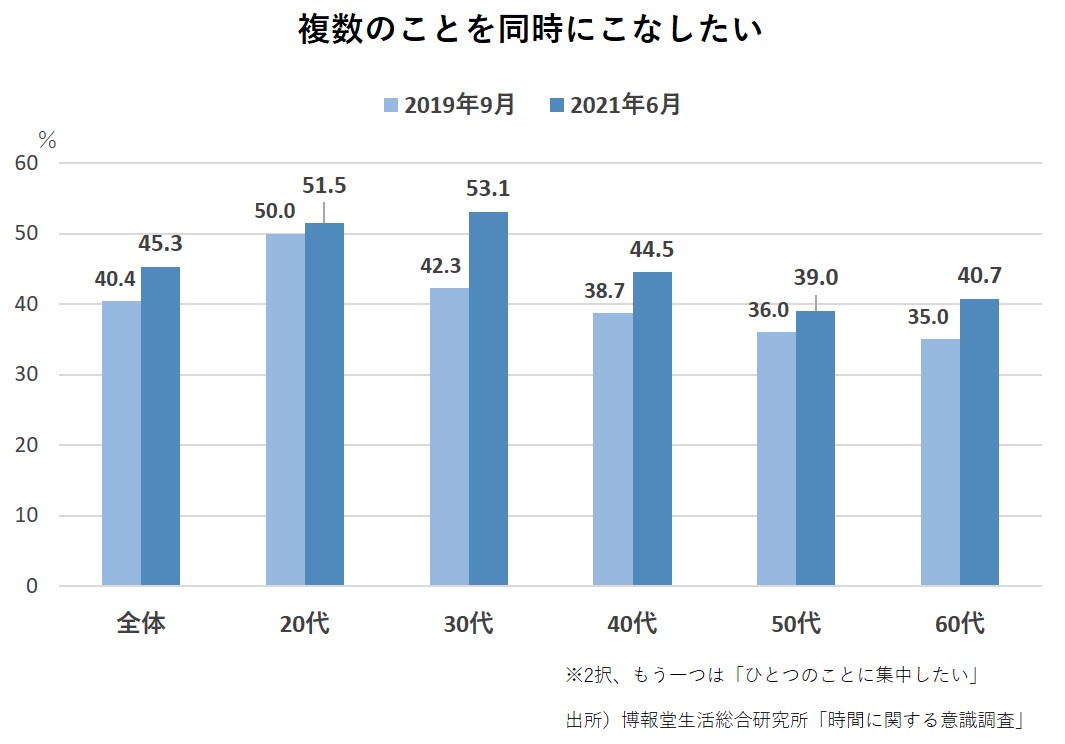 コロナ禍「前」にあたる2019年9月の調査(全国の20~69歳、1500人)で「あなたは複数のことを同時にこなしたい方か、ひとつのことに集中したい方か」を質問した。結果は複数同時派が全体平均40.4%で、若い層ほど高く20代では50.0%だった。