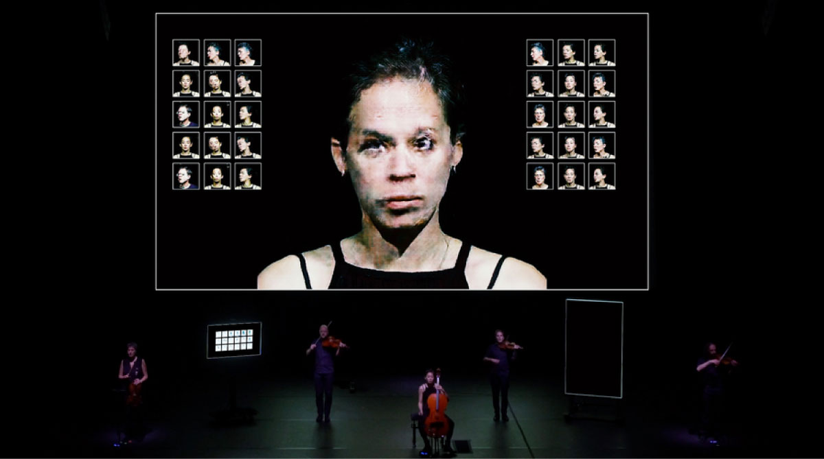 この写真は、演奏者たちの背後にあるスクリーンにAIのパラメータによって変換された、知っている本人の顔とは少し違う存在が生成されており、美しいけれど、どこか不気味さが残るパフォーマンスが映し出されています。