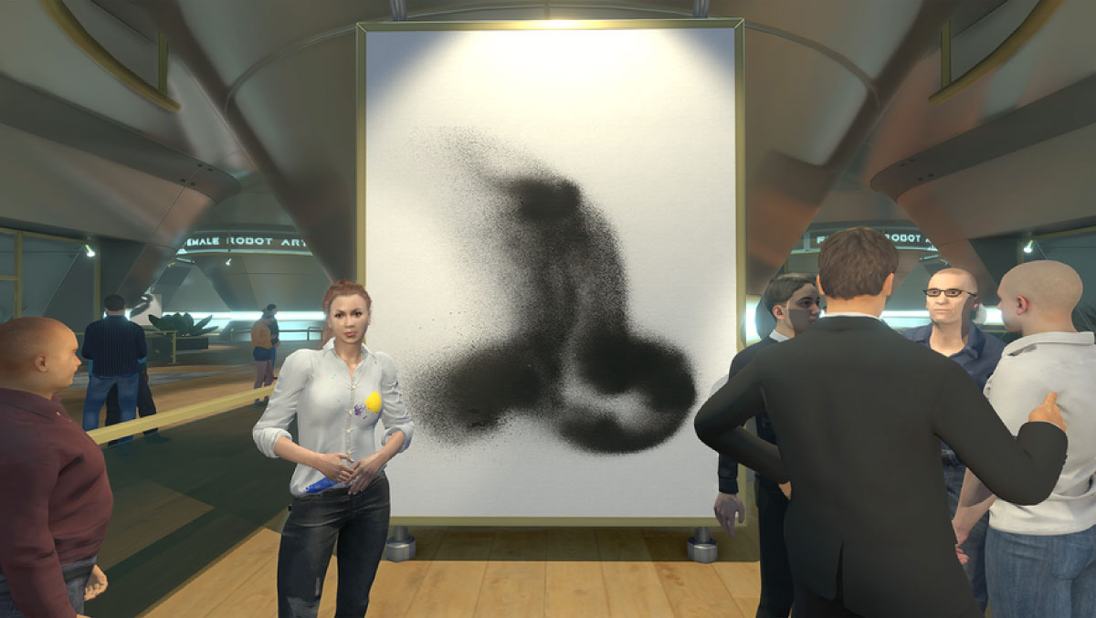 この作品は、架空の初の女性ロボットアーティスト「Ai-Da」を主人公としたドキュメンタリー形式の映像作品です。主人公のAIVAは30代半ばの女性ヒューマノイドロボットアーティストという設定で、アートの世界にもっと多様性をもたらす目的で、シスジェンダー男性(生まれたときに割り当てられた性別と性同一性が一致し、それに従って生きる男性)のエンジニアチームによって開発された存在です。映像はAIVAが男性ヌードモデルに様々な姿勢を指示しながら、キャンバスにスケッチを描くシーンから始まり、最後に彼女は大成功したアーティストとして個展が開催され、彼女の周りにはギャラリストと彼女を生み出したエンジニアチームが集まり、膨大な収益がもたらされるという、ハッピーエンドで締めくくられます。