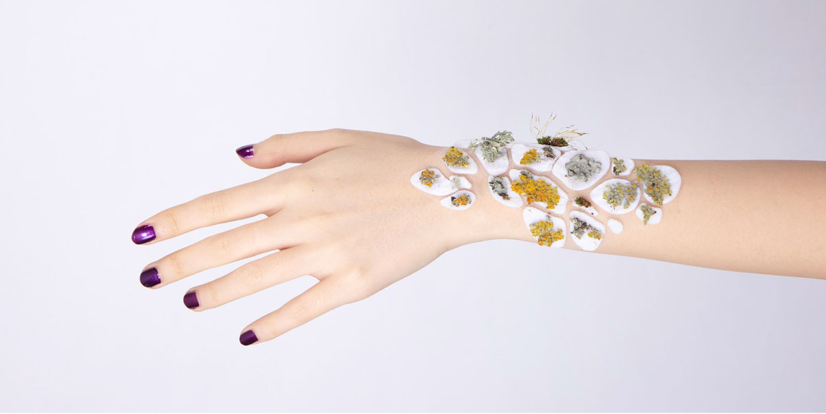 本作品は、もし人間がトネリコの代わりになれるとしたら?という問いを起点に、人間中心の考え方の自然観に疑問を呈し、人間が木に代わって宿主となる可能性を提示しました。アーティストたちは、トネリコの樹皮の質感、光量、多孔性、pHを模倣し、人間を生息地として機能する新しいマテリアルを開発しました。このウェアラブルは、人間の皮膚に貼り付けることで、菌類に一時的な家を提供しています。