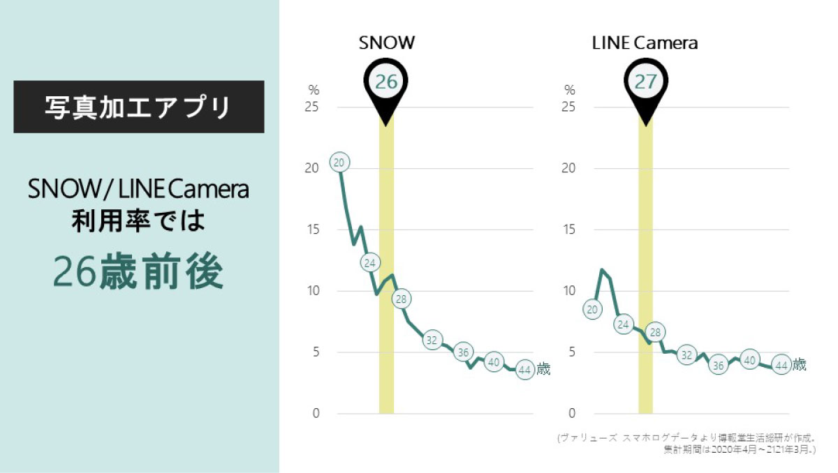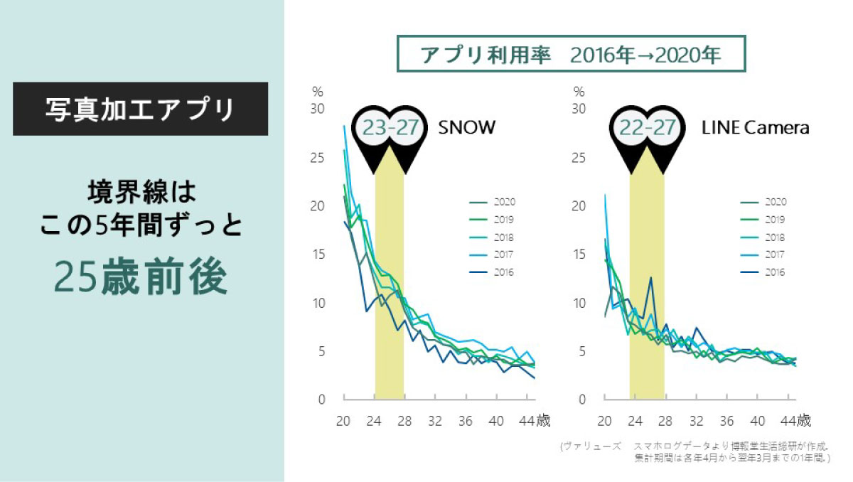次に、写真加工アプリのSNOWやLINE Cameraを見てみましょう。こうしたアプリの特徴は、単に写真を撮るだけでなく、肌や目などをより見栄え良く加工する機能を備えていることですが、「若者」の境界線は、26歳前後に現れました。