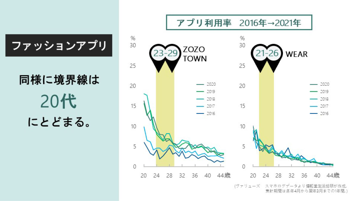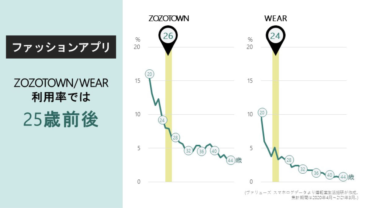 同様に、ZOZOTOWNやWEARといったファッションアプリを見てみましょう。服を買ったり、コーデを見つけたりするアプリですね。これらにおいては25歳前後に境界線が現れました。
