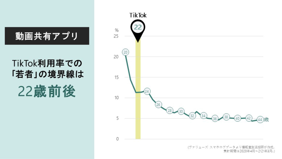 まず、若者に人気の動画共有アプリ、TikTokの年齢別利用率のグラフを見てみましょう。