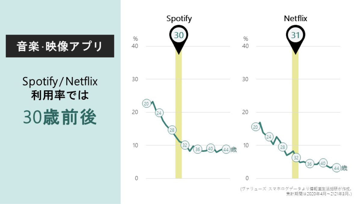 例えばSpotifyやNetflixといった、サブスクリプションで音楽や映像を楽しむカテゴリでは、境界線は30歳前後に現れます。