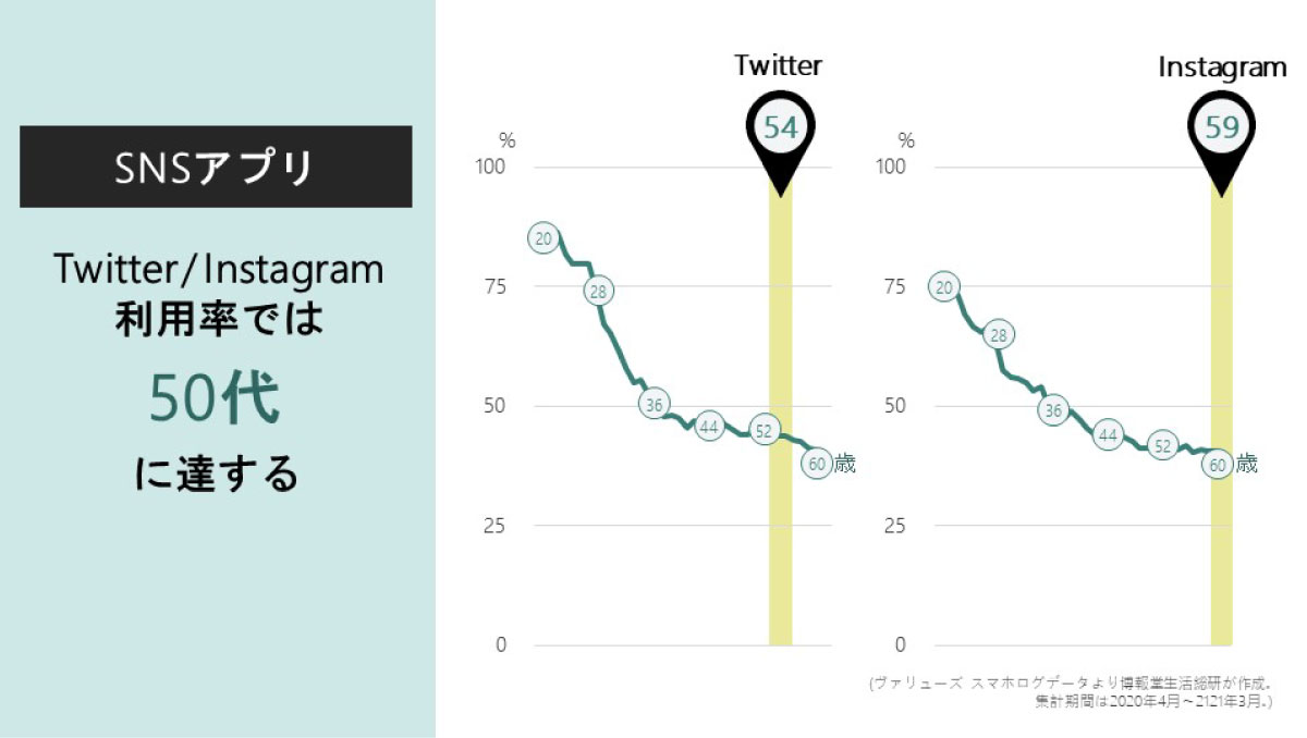 最後に、SNSアプリのTwitterやInstagramを見てみましょう。若者ターゲットのキャンペーンなどでも活用されるSNSですが、データで見ると、54歳や59歳といった、さらに上の年齢に境界線が現れました。