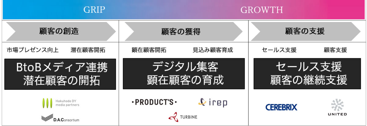 GRIP & GROWTHには、ほかに、デジタル広告全般を手掛けるDAC(デジタル・アドバタイジング・コンソーシアム)、営業支援会社のセレブリックス、BtoBコンテンツの制作を手掛けるタービン・インタラクティブ、戦略立案のプロフェッショナルであるユナイテッドといったグループ企業が参画しています。いずれの企業も、博報堂DYグループのフィロソフィーである「生活者発想」をビジネスのコアに据えています。BtoB領域においても、ビジネスパーソンを生活者と同じ目線で捉えることで、これまでにないビジネス支援ができると考えています。