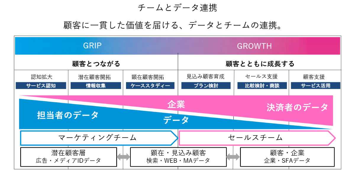 マーケティング側で見込み顧客のニーズをとらえるコンテンツをつくるには、セールス側の情報を解像度高く理解しておかなければならないということですよね。そのためには、データ連携、組織間連携、戦略づくりのそれぞれをトランスフォームしていく必要があります。そのお手伝いをするのも、GRIP & GROWTHの重要な役割です。