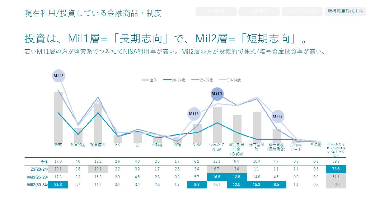 また、現在利用している金融商品・制度についての質問では、25~29歳はつみたてNISAなど長期の投資への関心が高く、30~34歳は株式や暗号資産といった短期の投資への関心も比較的高くなることがわかりました。年を重ねるに従い短期の投資に関心が移っているのは、チャレンジして短期間でお金を稼ぎたいと考える人が多いのではないかと考えられます。