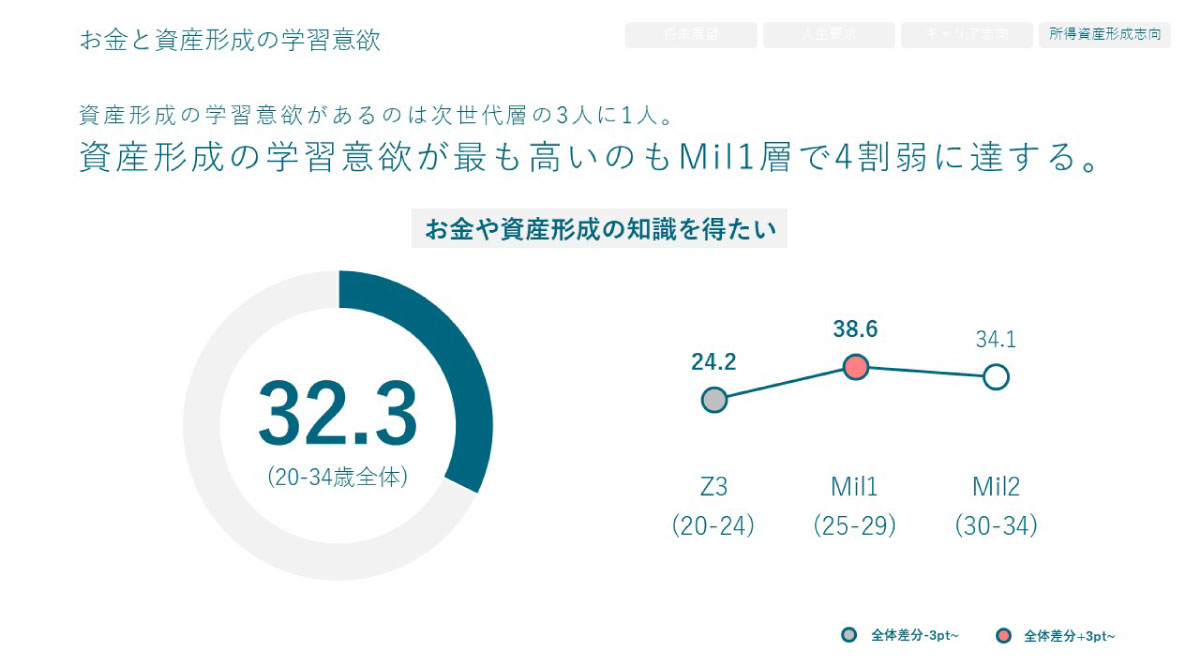 またこの世代は、約3人に1人がお金や資産形成の知識を得たいと考えていることもわかりました。特に25~29歳の層では4割弱に上ります。