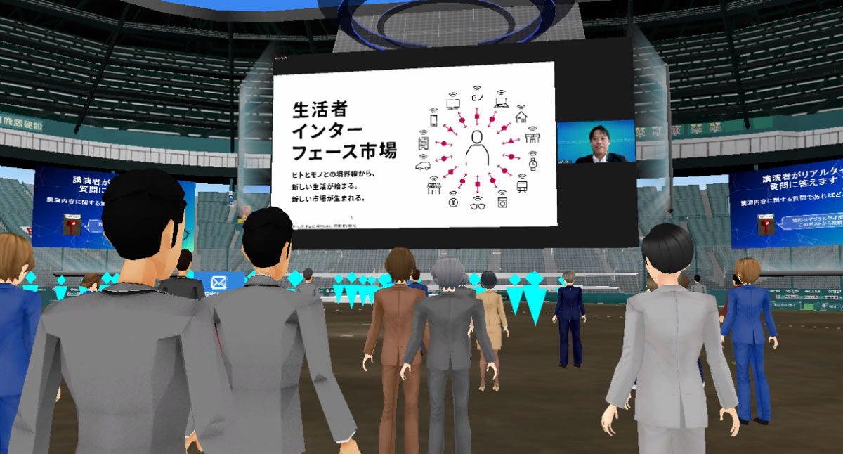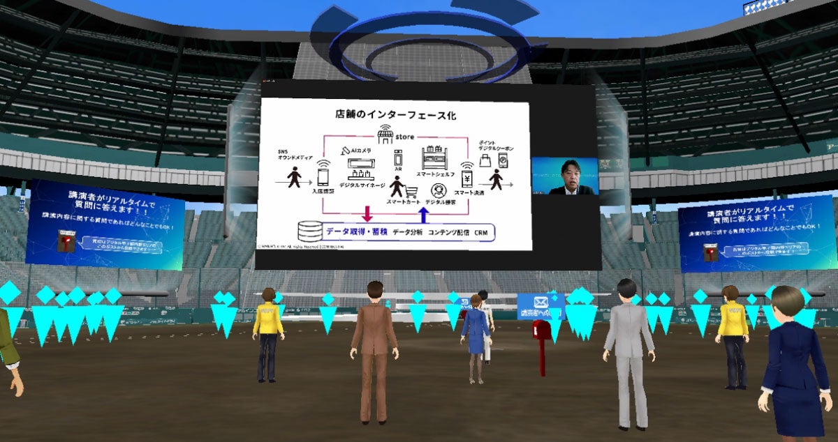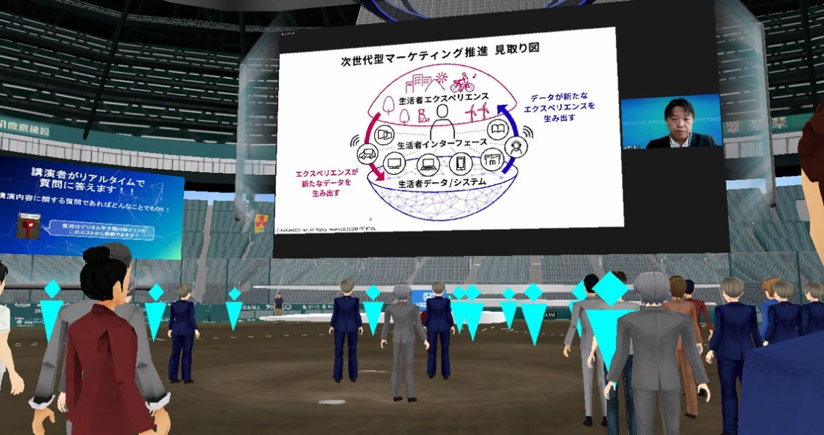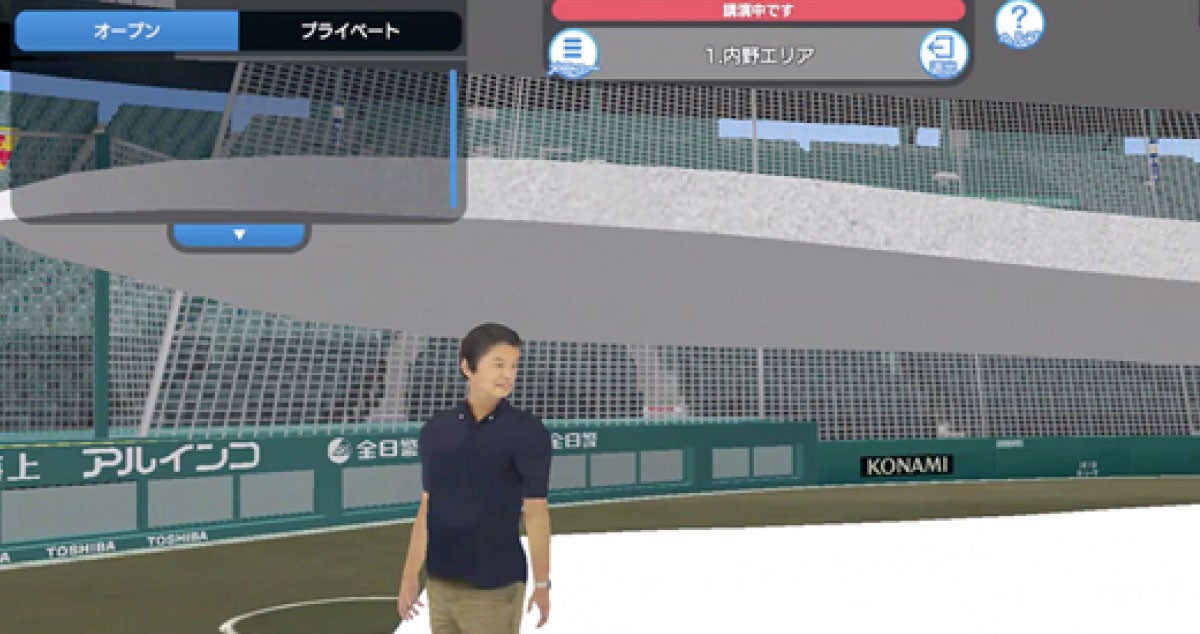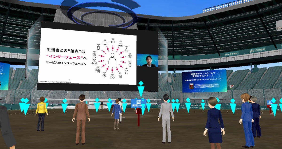 デジタル甲子園の参加者は、アバターを作成して会場内を移動します。内野エリアで講演開始を待っていると、青木執行役員のアバターが、素早くダッシュして横を駆け抜けて行き、ホームベース付近に設けられた登壇スペースに向けてジャンプ。飛び乗ると同時に、講演がスタートしました。