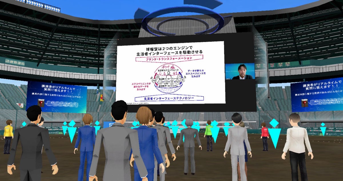 阪急阪神ホールディングスは2021年9月7~10日かけて、デジタル上に再現した甲子園を舞台にしたイベント「DXが変革するマネジメントのあり方やエンタテインメントの世界 in デジタル甲子園」を開催しました(関連記事:https://seikatsusha-ddm.com/article/11854/)。内野エリアに設けられた講演会場において、博報堂の青木雅人執行役員HAKUHODO DX_UNITED担当が「生活者インターフェース市場の拡大で求められる価値創造型DXの推進」と題して講演しました。また、博報堂DYホールディングスは外野エリアの展示会場にも出展し、hakuhodo-XRやDX_UNITED、マーケティングテクノロジーセンターのソリューション紹介やサイバーフィジカル空間に関する研究事例などの展示を行いました。