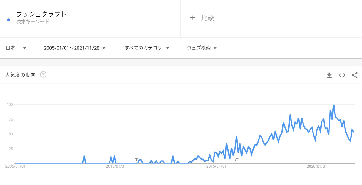 Googleトレンドで「ブッシュクラフト」と検索してみると、ここ数年間で急激に検索され始めていることがわかります。