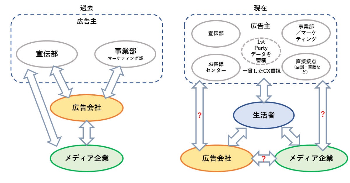 広告主と、広告会社やメディア企業、そして生活者の関係性がどのように変わってきたか、次のような図で表しました。従来(左側)、広告主では宣伝部や事業部が個別に広告会社とやり取りし、別途宣伝部が直接メディア出稿する場合もありました。