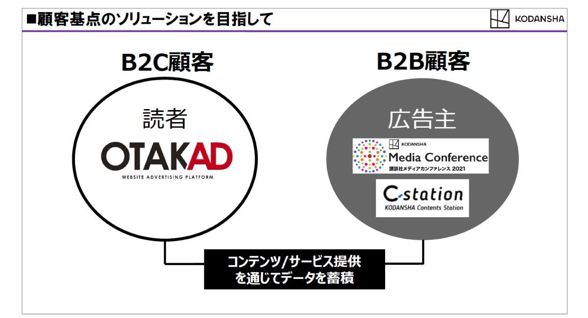 我々には、読者というBtoCの顧客と、広告主というBtoBの顧客がいます。現在、読者向けには「OTAKAD」での広告配信を通じて、また広告主には「C-station」や「講談社メディアカンファレンス」などを通してデータを蓄積しています。共通しているのは、コンテンツやサービスを提供し、そのフィードバックとして得たデータを蓄積して、またよりよい体験提供につなげるという循環の仕組みです。