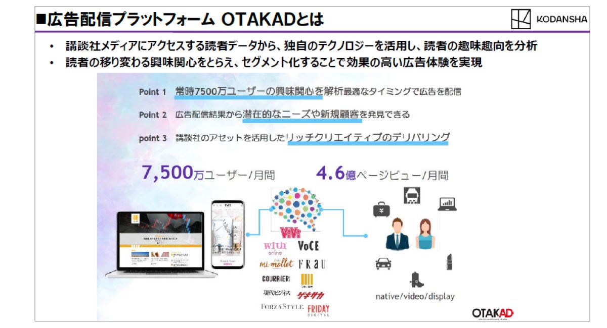 講談社の複数メディアに広告を配信できるOTAKADは、AaaSとの親和性が高そうです。今、企業もオウンドメディアを通して、購買データとはまた別に「どんなコンテンツで人の心が動くか」のデータを蓄積していますが、なかなか1社では嗜好性を理解できるほどコンテンツの量もバラエティも担保できないですよね。その点で、複数のメディアを通して取得できるデータは、かなり有益だと思いました。