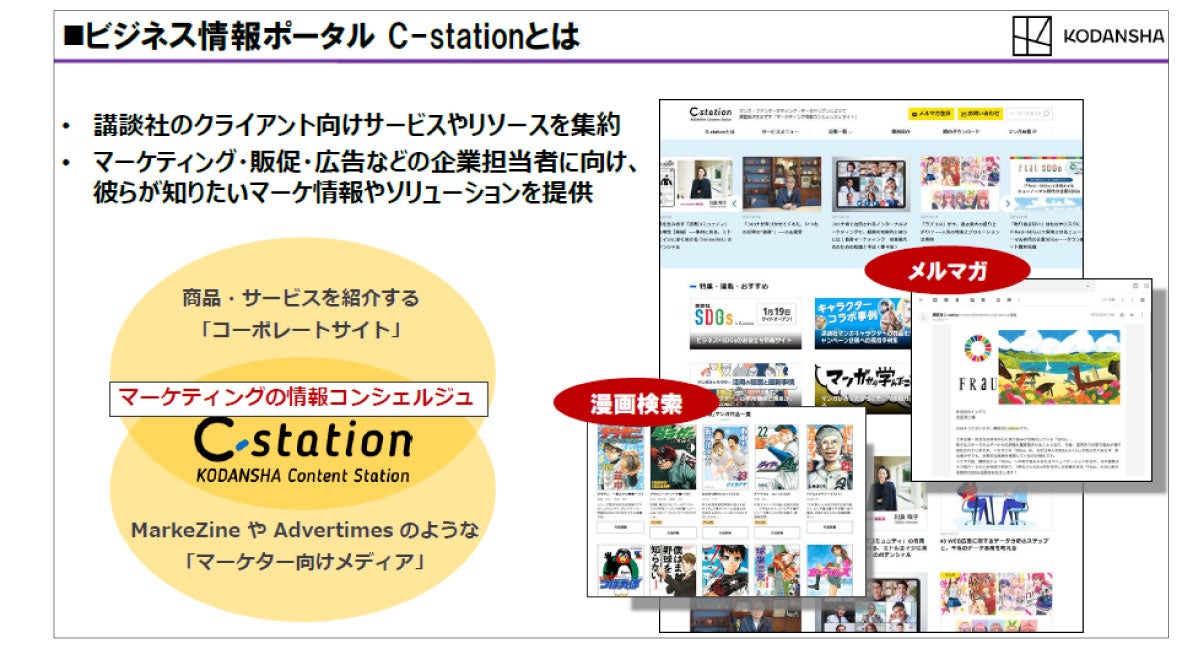 BtoB向けの「C-station」は、コンテンツマーケティングの専門メディアです。当社のクライアント向けサービスやリソースを集約しており、マンガ作品を検索できる機能もあります。一方、当社へのオンラインの商談窓口にもなっており、リード獲得の意図もあります。