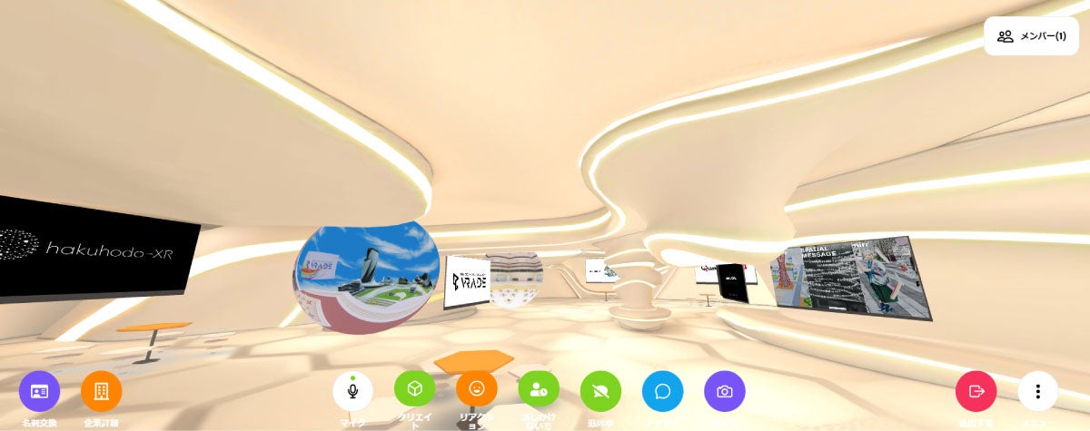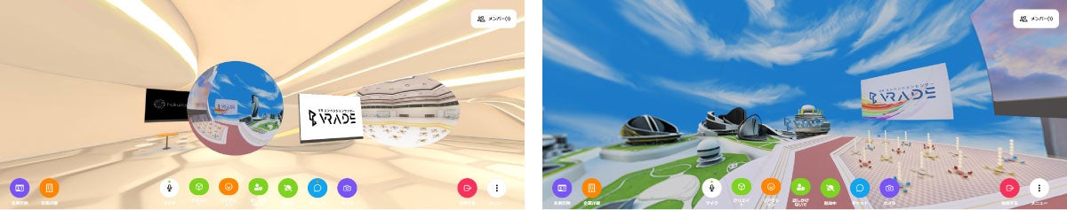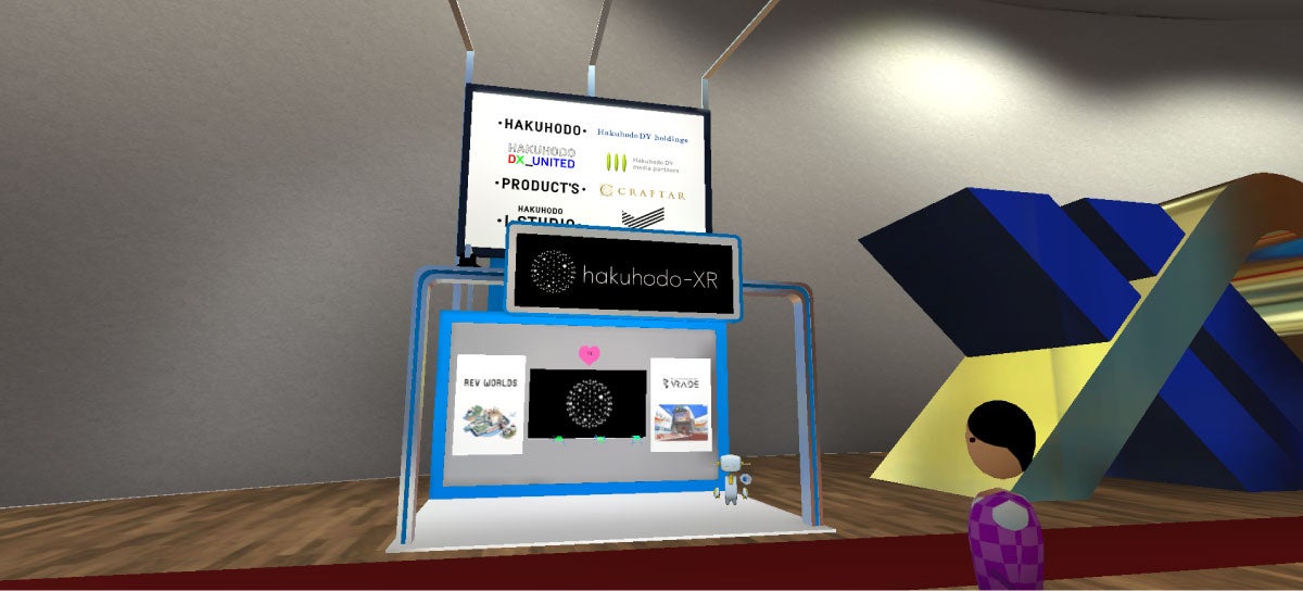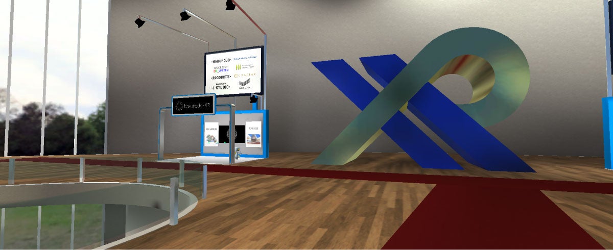 各社が展示をしている専用の3D空間は、主催者が用意したテンプレートを利用するか、自社で自由に構築するかを選べます。博報堂DYグループの展示は、博報堂DYメディアパートナーズと博報堂プロダクツがアーリーワークス、プレミアムアーツの協力を得て開発したVR空間構築ソリューション「VRADE」を活用して作られました。