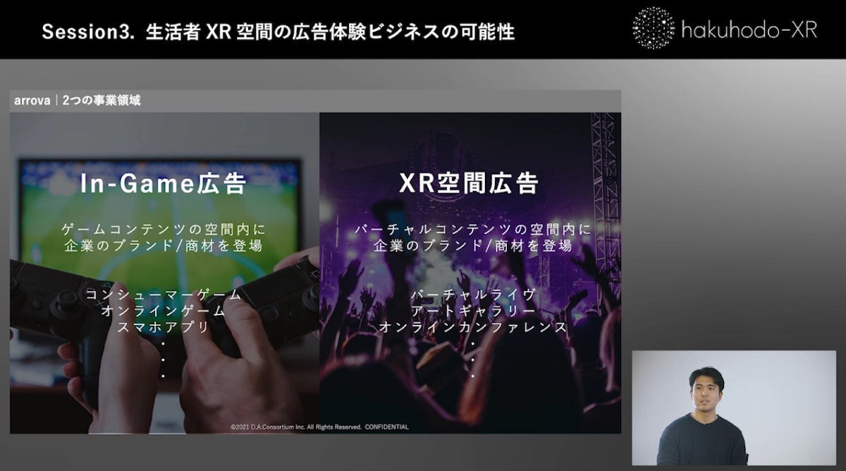 次は「生活者XR空間の広告体験ビジネスの可能性」です。XR空間上の広告ビジネスを開発しているhakuhodo-XRの荒井浩介さんに来てもらいました。荒井さんはデジタル・アドバタイジング・コンソーシアム(DAC)に所属しています。