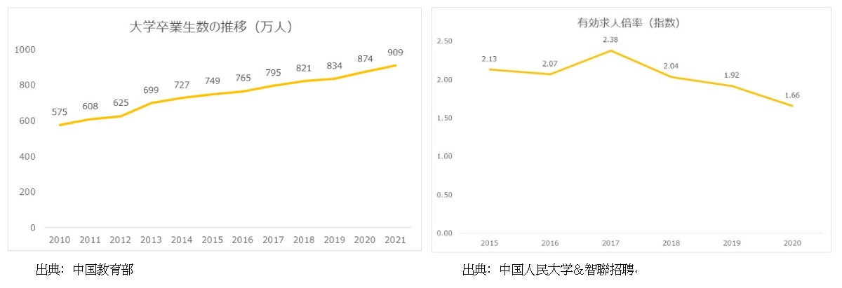 中国本土の大学卒業生の数は、年々増加傾向が続いており、昨年では909万人に達しています。一方で、経済成長の鈍化及びコロナの影響で企業の採用計画が縮小する動きもあるため、大学生の就職環境として一層厳しい状況になりました。