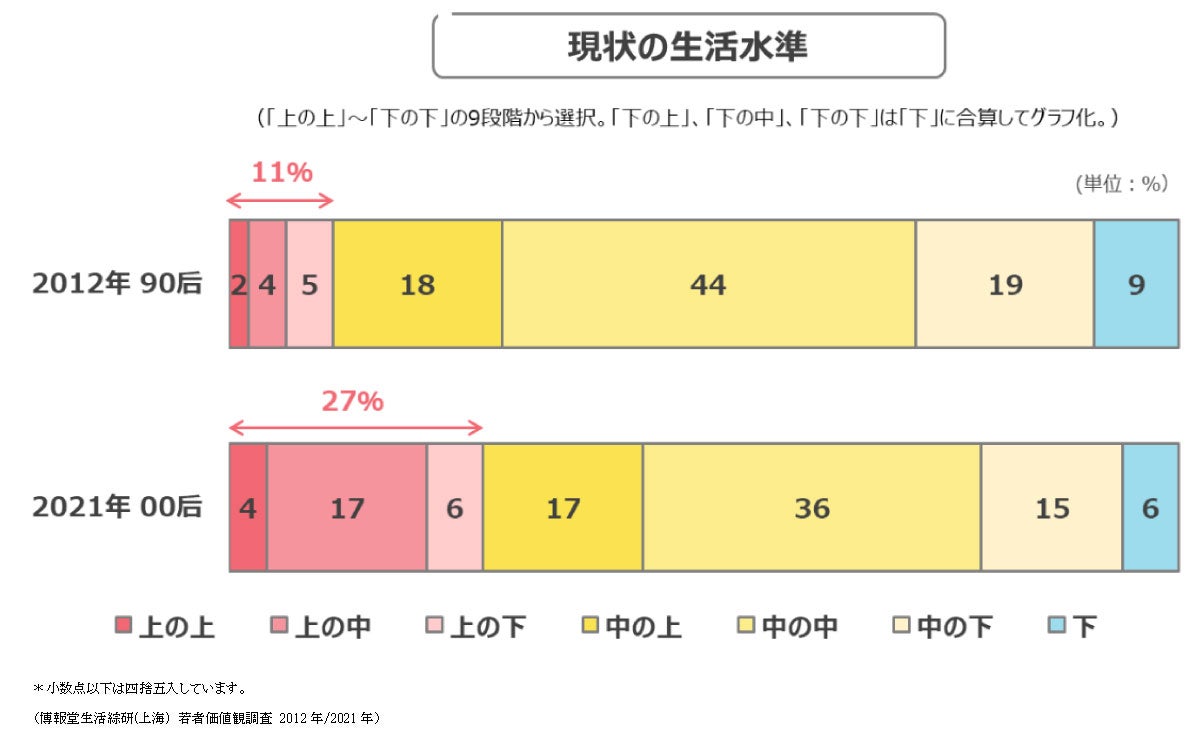 この10年の変化をみるべく、生活綜研(上海)が2012年と2021年に、それぞれ18-21歳の若者に対して行った調査結果を比較しました。自分の生活水準が「上の上」から「下の下」の9段階のうちいずれにあたるかを回答してもらったところ、「上の上」、「上の中」、「上の下」のいずれかにあたる(「上」級にあたる)と回答した人が11%から27%へと、約2.5倍に増加しています。