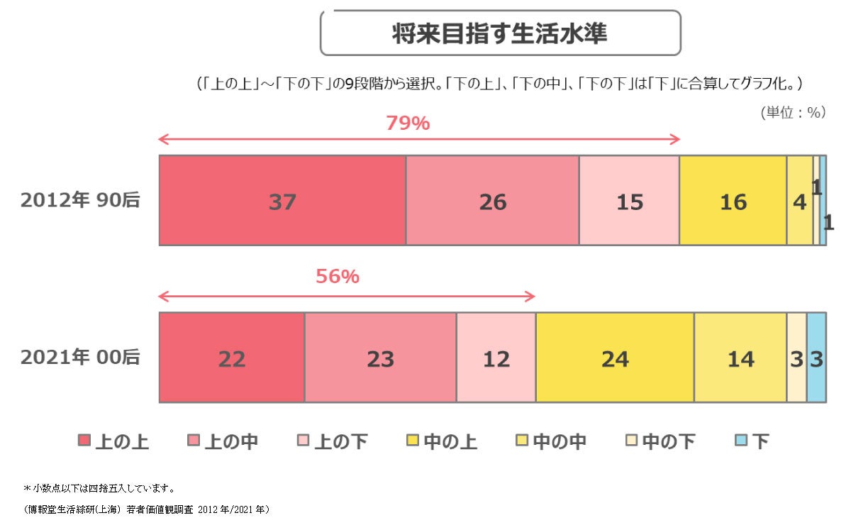 また、将来的に目指す生活水準についても聴取してみたところ、2012年には「上」級を目指すと回答した人が79%、中でも最上位の「上の上」級を目指すと回答した人も37%いました。しかし2021年の調査では「上」級を目指す人が56%、「上の上」級を目指すという人は22%にそれぞれ減少。約10年前に比べ、「中」級の生活でも十分豊かであるため、わざわざ「上」級である必要がなくなっているという解釈もできますが、自分の生活水準の高さを認識しつつも、人より「上」級の生活を手にしたいと考える傾向が弱まっているようです。