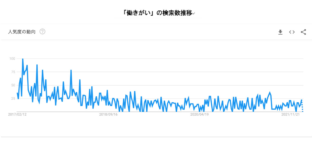 この潮流が素晴らしい点は後ほど述べていこうと思いますが、大きな社会視点で考えると社会全体において「働きがい」に対する意識が低下していることに対する打ち手になるかもしれないという点です。実際に検索数でみてみても、ここ5年間で「働きがい」というワード自体への関心が著しく低下していることが見て取れます。