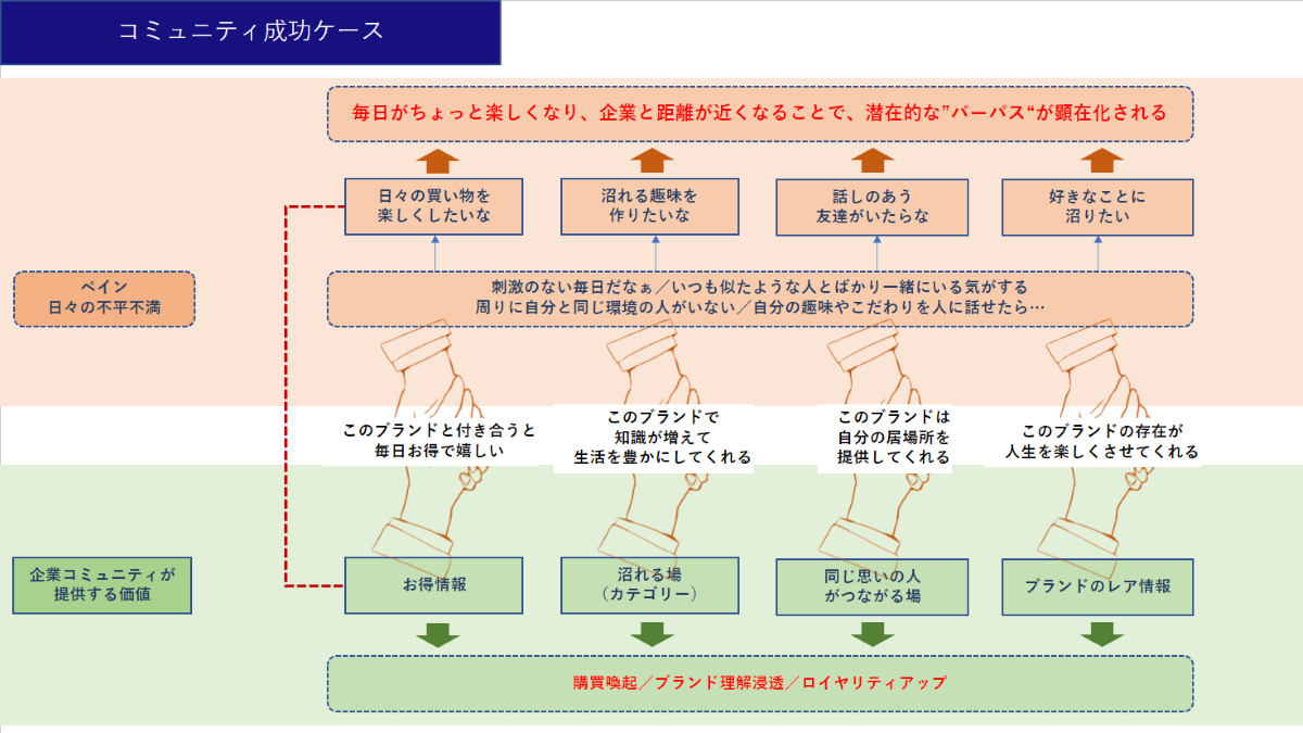 コミュニティをつくる際は、企業はお客様の日々の不平不満と、自社コミュニティが提供できることのマッチングを考える必要があります。刺激のない日常、自分と似た環境の人が周りにいない、趣味について語る相手がいないなどといった誰にでもあるペインに対し、日々の買い物をちょっと楽しくしたり、沼れる趣味を作ったり、話の合う人を探せるような適切な場や情報を企業コミュニティが提供することで、ウィンウィンの関係になれるのです。さらに「このブランドと付き合うと毎日お得で嬉しい」「このブランドで知識が増えて生活が豊かになる」「このブランドが自分の居場所を提供してくれる」「このブランドの存在が人生を楽しくさせてくれる」といった関係性が築ければ、企業は購買喚起やロイヤリティアップというメリットが得られ、生活者は企業と距離が近くなることで潜在的なパーパスが顕在化され、両者が同じ方向に向かっていける。こうして顧客と企業の目的を近づけることができます。