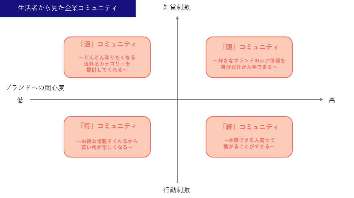 企業コミュニティをタイプ分類すると、お得情報で買い物が楽しくなる「得」コミュニティ、沼れるカテゴリーを提供する「沼」コミュニティ、共感できる人同士繋がれる「絆」コミュニティ、ブランドのレア情報を入手できる「限」コミュニティがあります。たとえばあるガス会社ではポイントや節約金額を可視化し節電キャンペーンなどを実施する「得」コミュニティを、ある食品メーカーではキャンペーンで当たるトマトの苗を育てる過程で出た疑問を質問できたり、野菜全般の知識が得られる「沼」コミュニティを、ある銀行はお金の相談ができ、共感や納得できる情報を得られる「絆」コミュニティを、ある自動車メーカーはファン同士熱く語り合いつながれる「限」コミュニティを持っています。それぞれ企業にとっては、「得コミュニティ」では離脱防止を図れ、「沼コミュニティ」ではカテゴリーリーダーのポジションを獲得でき、「絆コミュニティ」では本音の意見を吸い上げることができ、「限コミュニティ」ではロイヤリティアップを図れるというメリットがあります。