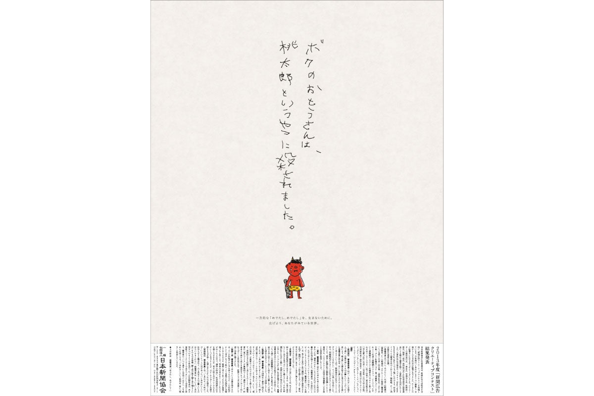 2013年、「しあわせ」をテーマにした日本新聞協会の広告コンテストに応募しました。「ボクのおとうさんは、桃太郎というやつに殺されました。」というコピーを書いて、最優秀賞を受賞したんです。