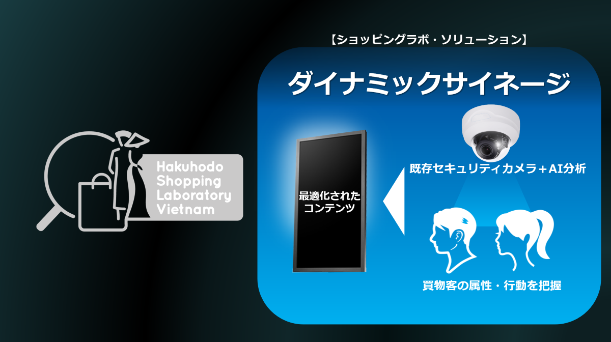 今回の研究は、ベトナム・ホーチミン市に約2,000平方メートルの広大な売り場面積を有するライフスタイル全般を提供する大型店舗で実施しました。そこで、ショッピングラボベトナムのオリジナルソリューションであるセキュリティカメラを活用したAIによる来店者の属性判定と、その属性に合わせたコンテンツを流すことができるデジタルサイネージを組み合わせた機器を店頭に設置し、ショッピングラボ分析チームの長谷川恭平さん、阿部佳織さん、中川愛理さんを中心に来店者の購買行動を調査しました。