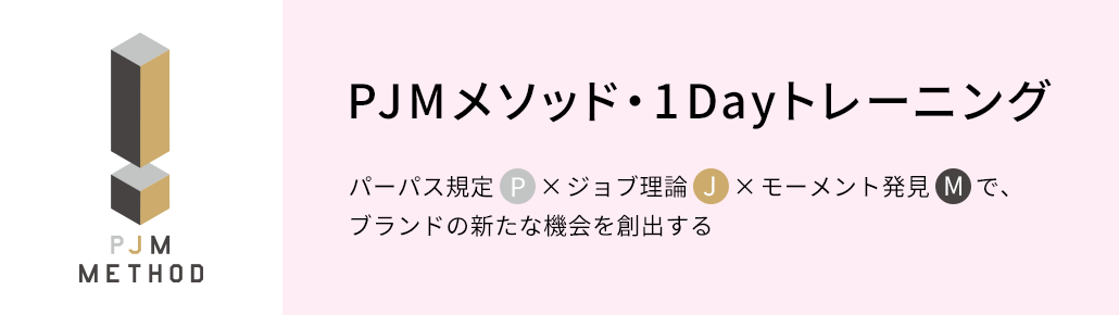 「パーパス」(P)という視点でのブランドの存在理由の定義、クリステンセン教授の「ジョブ理論」(J)を活用したカテゴリー外のシェアソースの発見、そして「モーメントリサーチ」(M)による生活者とのエンゲージメントチャンスの発掘。「PJMメソッド」は、従来型の方法論とは異なる、博報堂グループ独自の「UX(顧客体験)を開発する」アプローチであり、「マーケティング戦略をアップデートする」アプローチです。