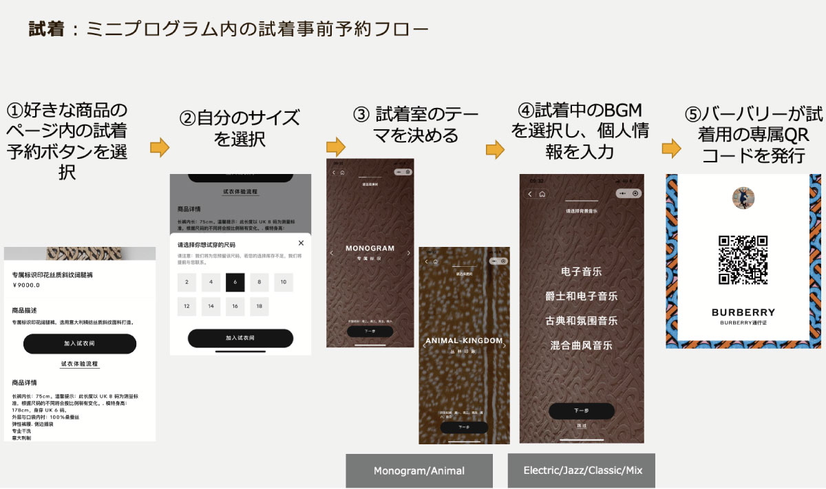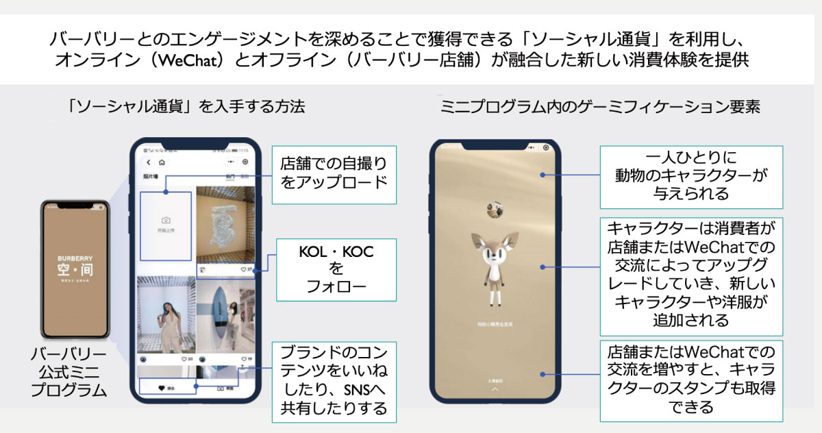 象徴的なケースとして、バーバリーの事例があります。7月末、バーバリーはテンセントと連携し、テンセント独自のソーシャルリテールストアを深圳にオープンさせ、同店舗専用のミニプログラムもリリースしました。ミニプログラムのユーザー登録の際には自分用のキャラクターが入手でき、店舗の予約、試着、ほかの人とのコミュニケーションなどを重ねることで、ソーシャル通貨を経由してこのキャラクターに好きな服を着せたり、成長させたりすることができます。