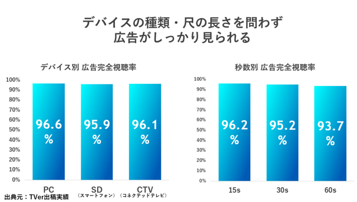 それは非常に大きなポイントです。CMの視聴完了率は95%を超えています。ほとんどのCMはしっかり最後まで見てもらえているということです。地上波テレビのように、CM中にほかのチャネルをザッピングするという行動が、TVerでは(視聴を中断することになるため) 見られません。