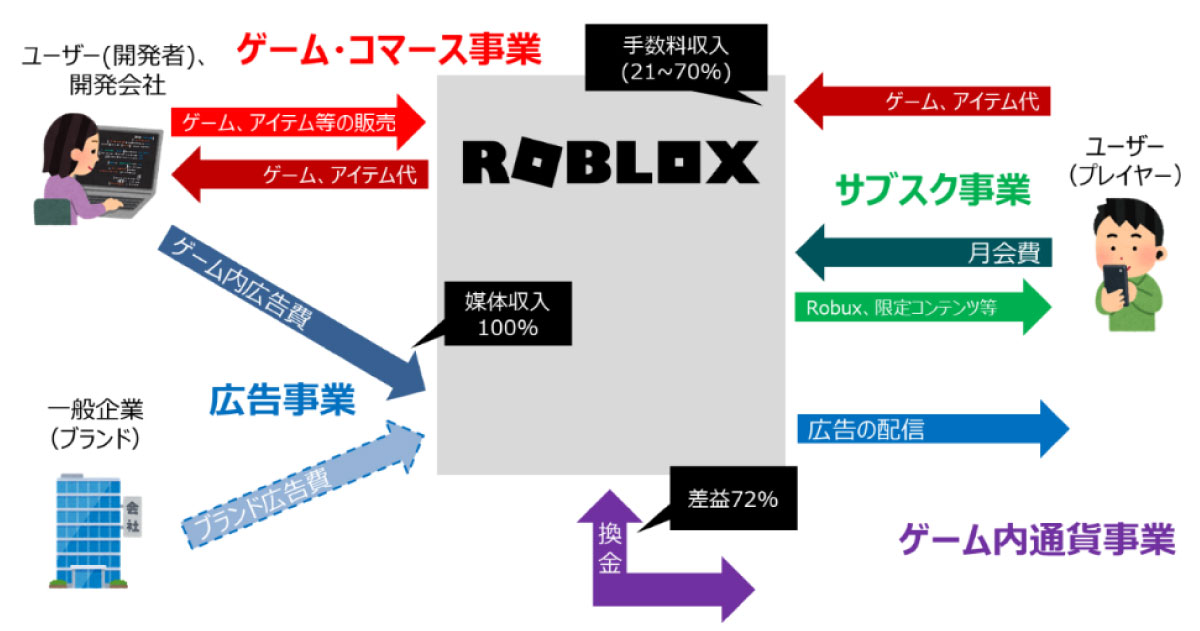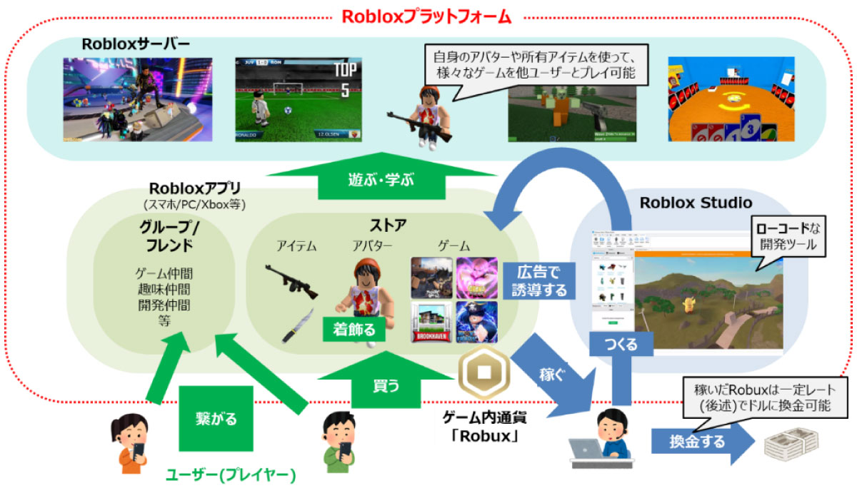 Robloxでは、プレーヤーがRoblox内にあるストアで一部の有料ゲームを購入したり、アバター用の服やアイテムを購入したりして遊びます。ほかのプレーヤーと友達になったりグループになったりして一緒に遊ぶこともあります。Roblox Studioというローコードでゲームを開発できるツールも提供されているので、開発者はそれを使ってゲームをつくってストアに公開し、そこでゲームやアイテムが購買されることでRobuxを稼ぎ、ドルに換金すれば収益化することができるというエコシステムになっています。