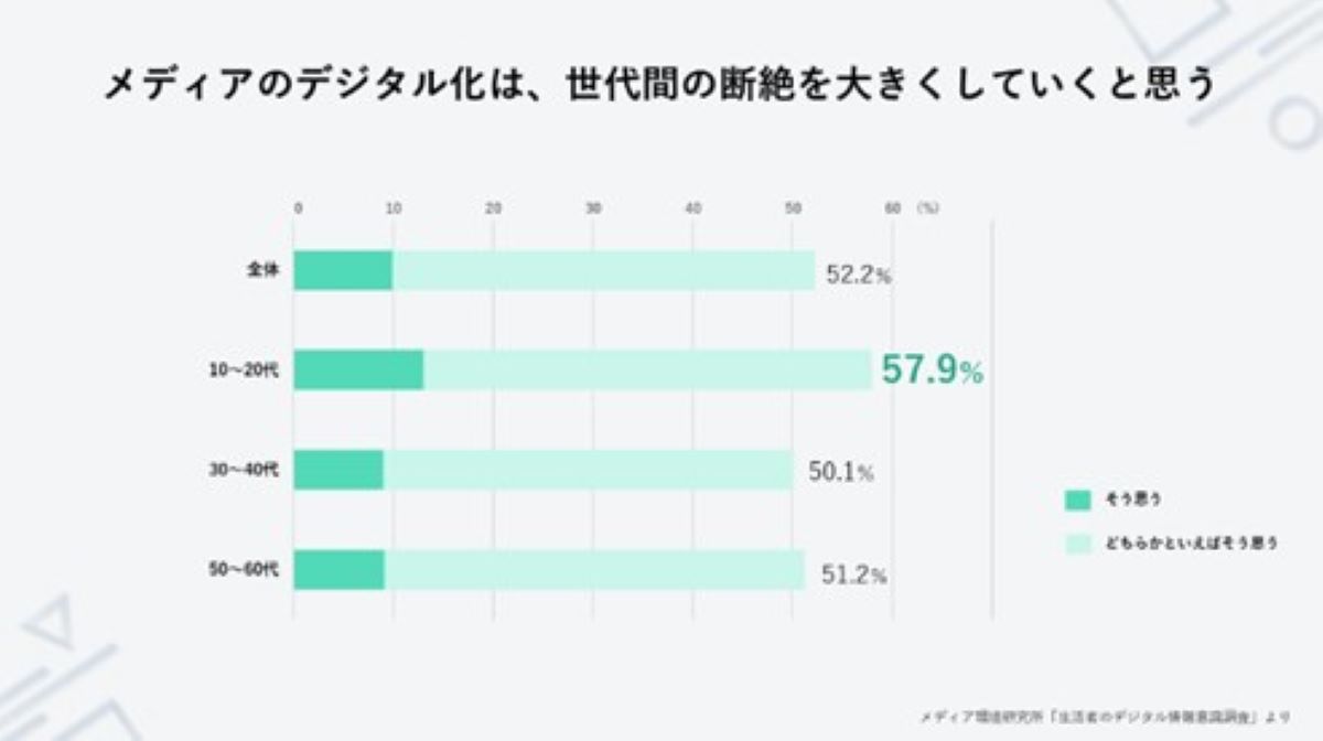 新美:これらの意識はメディアのデジタル化によってますます高まり、世代間の断絶を大きくしていくと考えられます。従来のように情報を伝えるだけでは、人と人とをつなぐことは困難です。