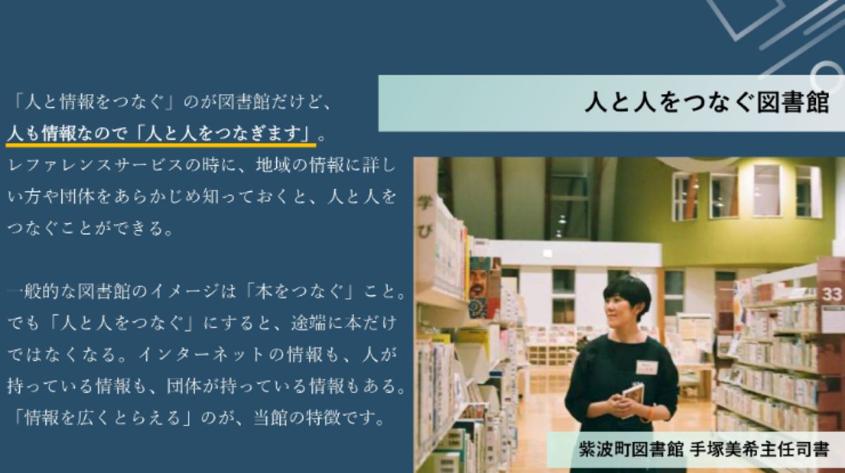 同館の手塚美希主任司書は、人と情報をつなげるのが図書館だけれど、「人も情報だから人と人をつなげる」と語ります。