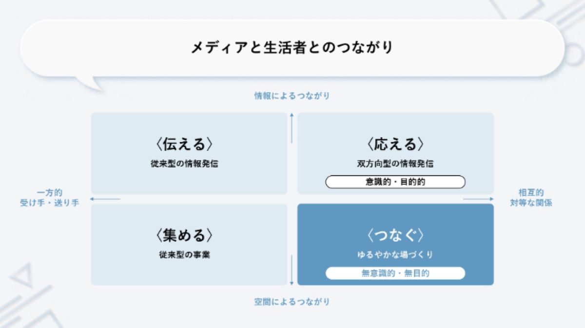あまりお膳立てしすぎずに、人と人をただゆるやかにつなぐ。ここにメディアと生活者のこれからの関係のヒントがあるのではないでしょうか。